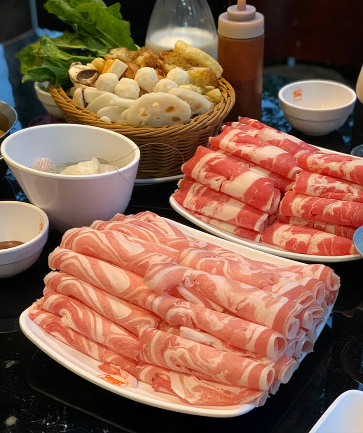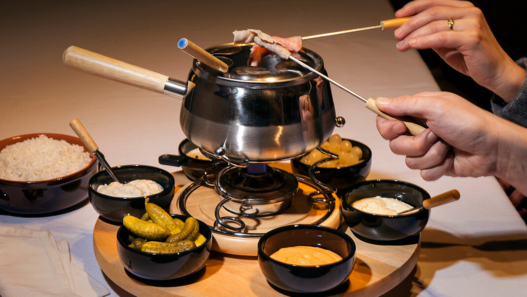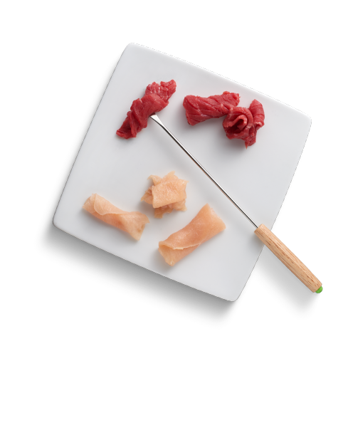 Wählen Sie für Ihr Fondue Chinoise sehr zartes Fleisch, das sich zum Kurzbraten eignet, wie Fleisch von der Rinderhüfte, Kalbs- oder Schweinefilet, Poulet- oder Trutenbrust. Rechnen Sie pro Person mit 200–220 g Fleisch. Die Fleischscheiben sollten etwa 4 mm dick sein, damit sie schnell und gut durchgaren. Unser Tipp: Nehmen Sie einen Teil des Fleisches erst kurz vor Beginn des Fondueplausches aus dem Kühlschrank und holen Sie immer wieder kleinere Mengen nach. So bleibt das Fonduefleisch frisch.