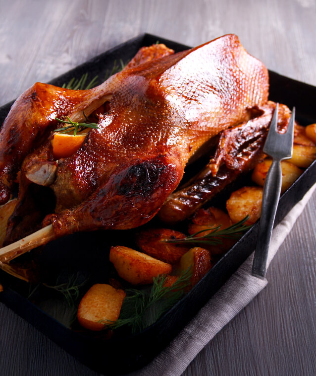 Gänse und Enten sind sich sehr ähnlich. Auch Gänsefleisch ist dunkel, aromatisch und relativ fetthaltig, allerdings sind Gänse deutlich grösser. An den Festtagen wird für gewöhnlich eine ganze Gans serviert. Wem das zu viel ist, der bevorzugt Gänsebrust oder Gänsekeulen. Gänsefleisch verträgt kräftige Gewürze wie Thymian, Rosmarin, Beifuss und Majoran.